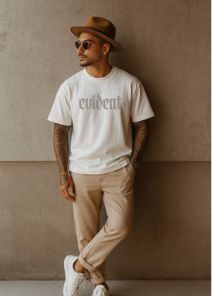 - Tipografía gótica “evident” en el pecho en gris oscuro.